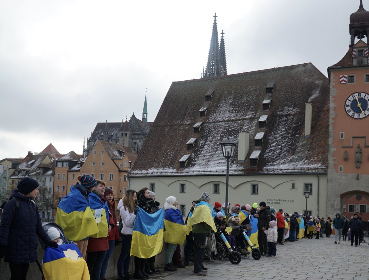 Über 400 Teilnehmer bildeten eine Menschenkette auf der Steinernen Brücke in Regensburg unter dem Motto "Einigkeit macht stark".