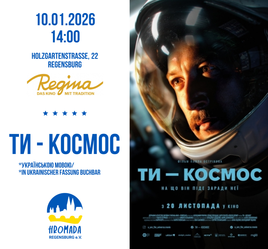 Hromada Regensburg e.V. та @reginakinoregensburg запрошують на перегляд фільму "Ти космос"! Український космічний далекобійник Андрій перевозить ядерні відходи з Землі на супутник Юпітера. Після несподіваного вибуху Землі, уламки якої знищують все навколо, Андрій залишається останньою людиною у Всесвіті. Та раптом на звʼязок виходить француженка Катрін, яка потребує допомоги. Попри відстань та перешкоди, Андрій вирішує врятувати її за будь-яку ціну. 📅 Коли? 10 січня 2025 року о 14:00 📍 Де? Holzgartenstraße 22, кінотеатр @reginakinoregensburg маленький зал 💙💛 Мова показу: українська з німецькими субтитрами 🎟 Квитки можна придбати в касі кінотеатру або на сайті reginakino.de 🤗 Поспішайте, квитки розкупають швидко! 🤓 Це кіно орієнтовано на дорослу аудиторію! До зустрічі в кіно! 💙💛