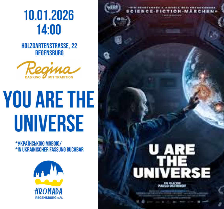 🇺🇦 Hromada Regensburg e.V. та @reginakinoregensburg запрошують на перегляд фільму "Ти космос"! Український космічний далекобійник Андрій перевозить ядерні відходи з Землі на супутник Юпітера. Після несподіваного вибуху Землі, уламки якої знищують все навколо, Андрій залишається останньою людиною у Всесвіті. Та раптом на звʼязок виходить француженка Катрін, яка потребує допомоги. Попри відстань та перешкоди, Андрій вирішує врятувати її за будь-яку ціну. 📅 Коли? 10 січня 2025 року о 14:00 📍 Де? Holzgartenstraße 22, кінотеатр @reginakinoregensburg маленький зал 💙💛 Мова показу: українська з німецькими субтитрами 🎟 Квитки можна придбати в касі кінотеатру або на сайті reginakino.de 🤗 Поспішайте, квитки розкупають швидко! 🤓 Це кіно орієнтовано на дорослу аудиторію! До зустрічі в кіно! 💙💛